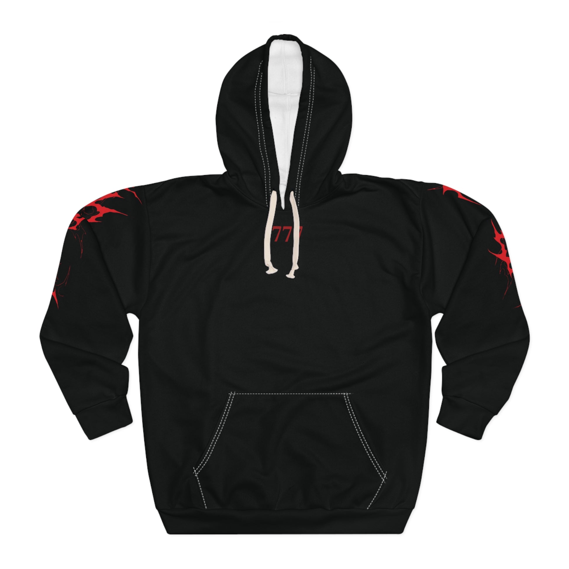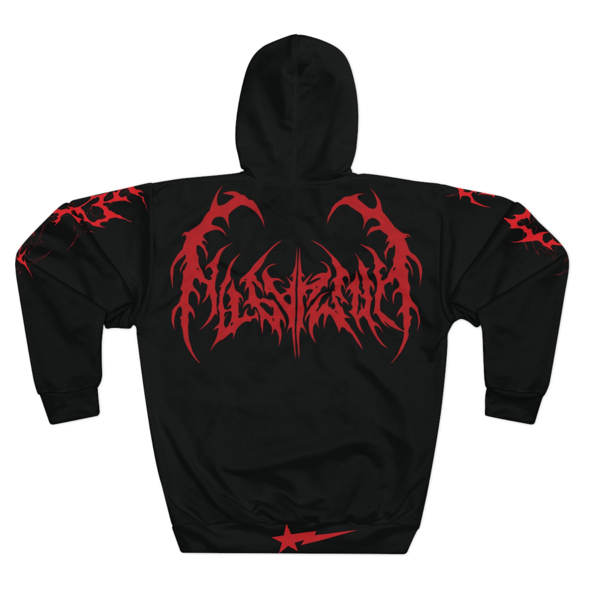 A bold, all-over printed hoodie that leans into dark, underground energy. The black base is a canvas for razor-sharp red graphics—spiky sigils across the shoulders and a stylized emblem across the back—that read like street-ready ritual wear. It sits with a roomy, classic cut and a deep kangaroo pocket for keeping hands warm or stashing essentials. The hood’s long drawstring and custom cut-and-sewn construction give it a handcrafted, statement feel. Wear it when you want to move through city nights or basement shows with a steady, uncompromising presence.